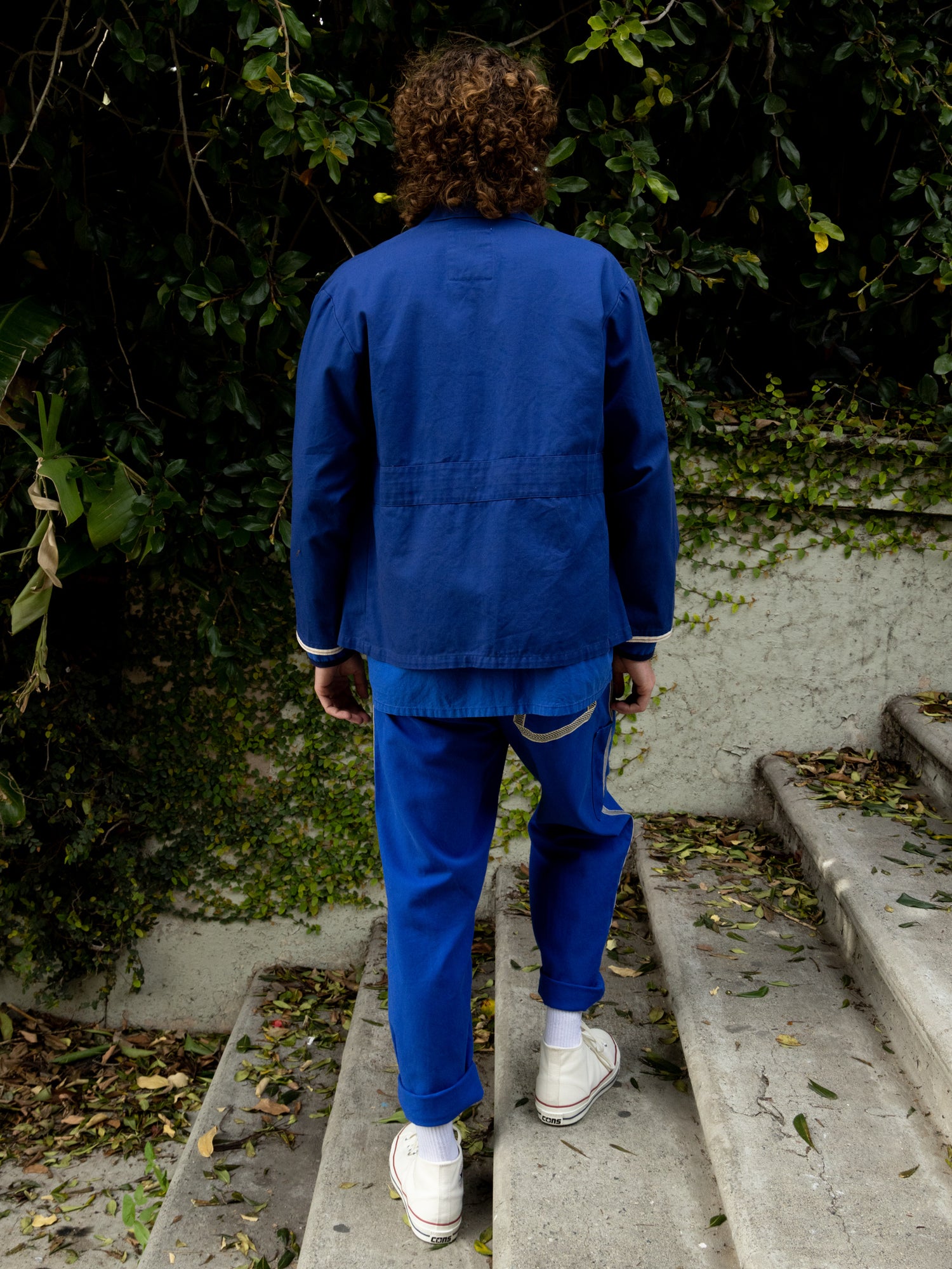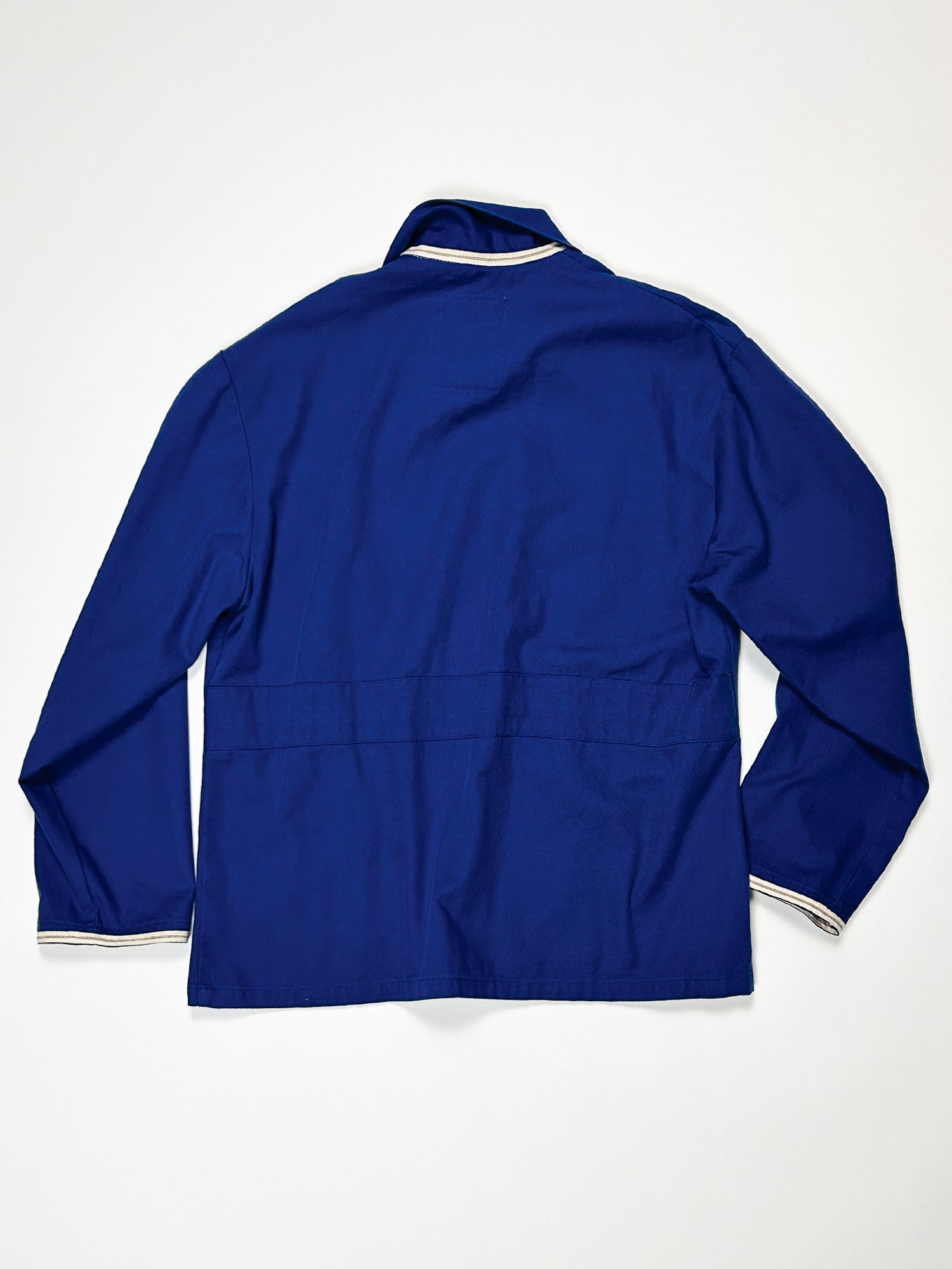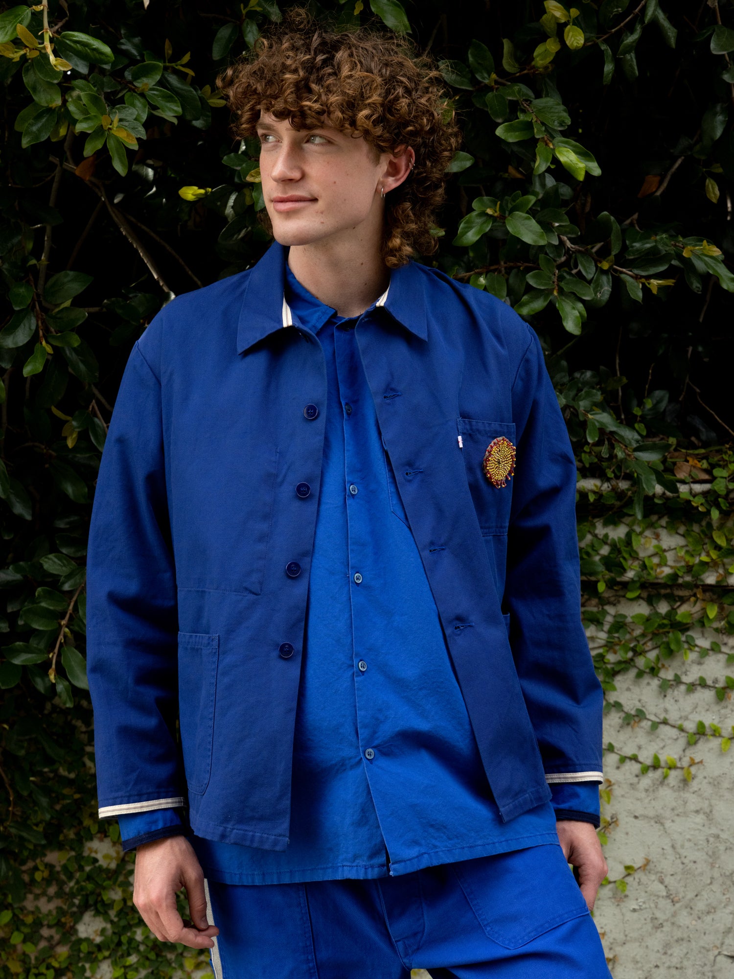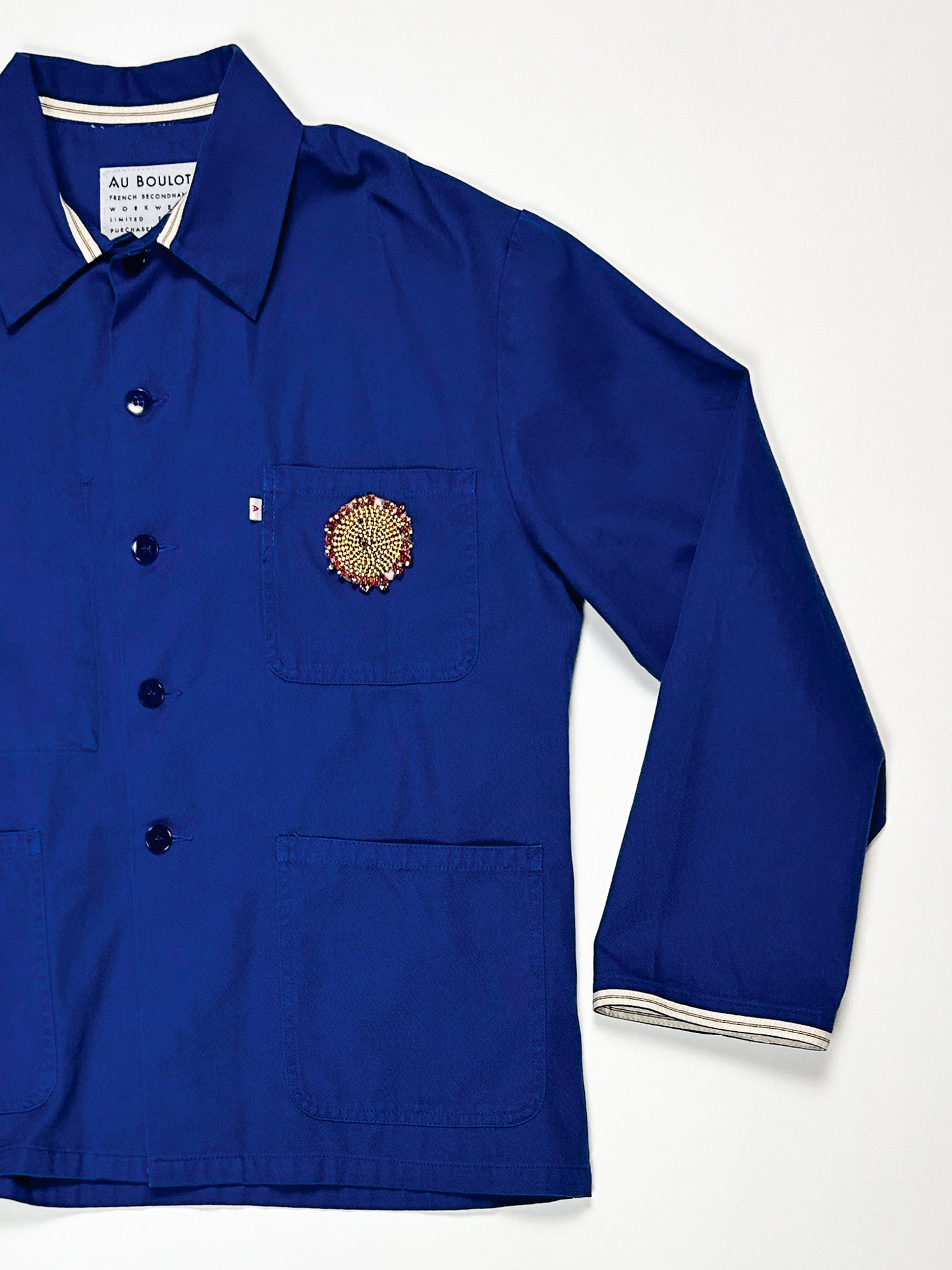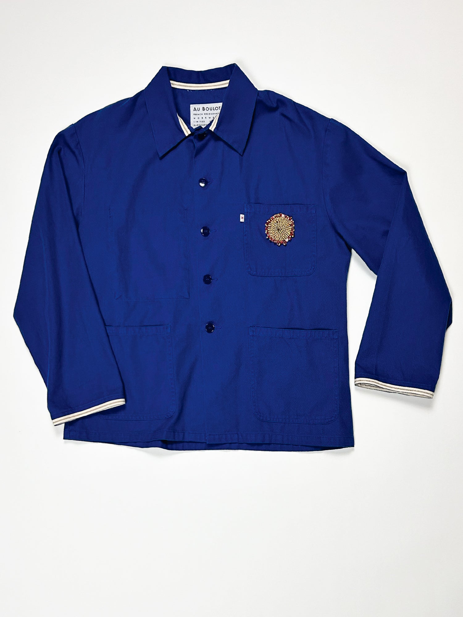 This one-of-a-kind secondhand workwear jacket button front. Has been up-cycled with a vintage beaded patch and trim at the cuff and collar.
