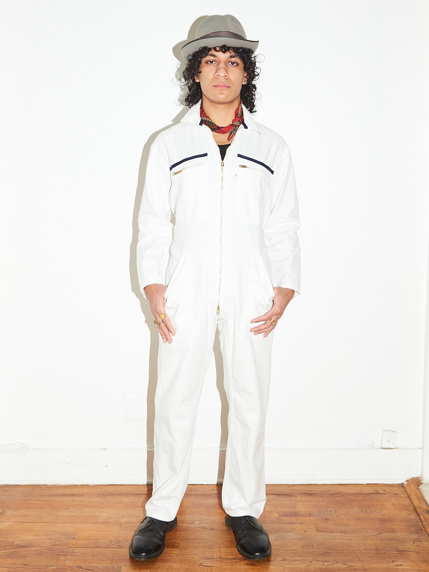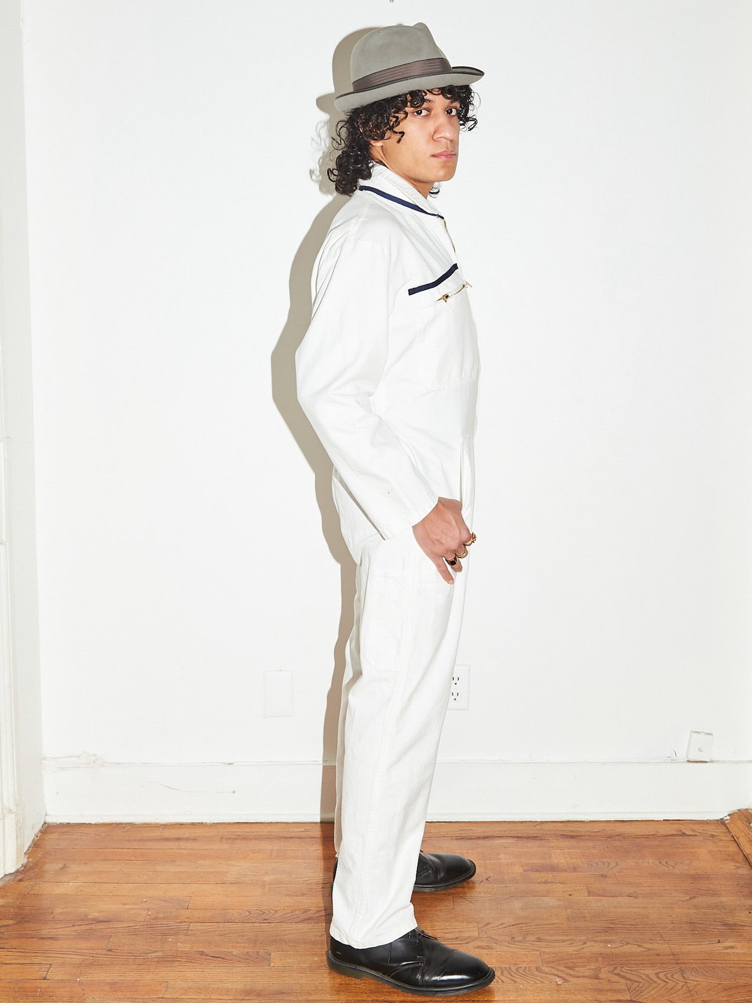 This Limited Edition secondhand workwear Suit with a button zip front placket and cinched waist has been up-cycled with a navy twill tape neck and front pockets.