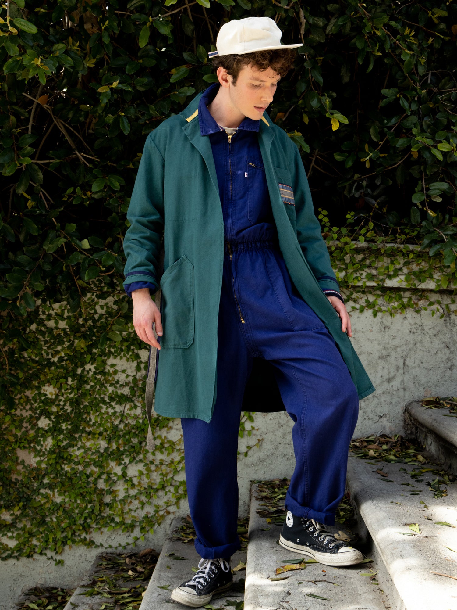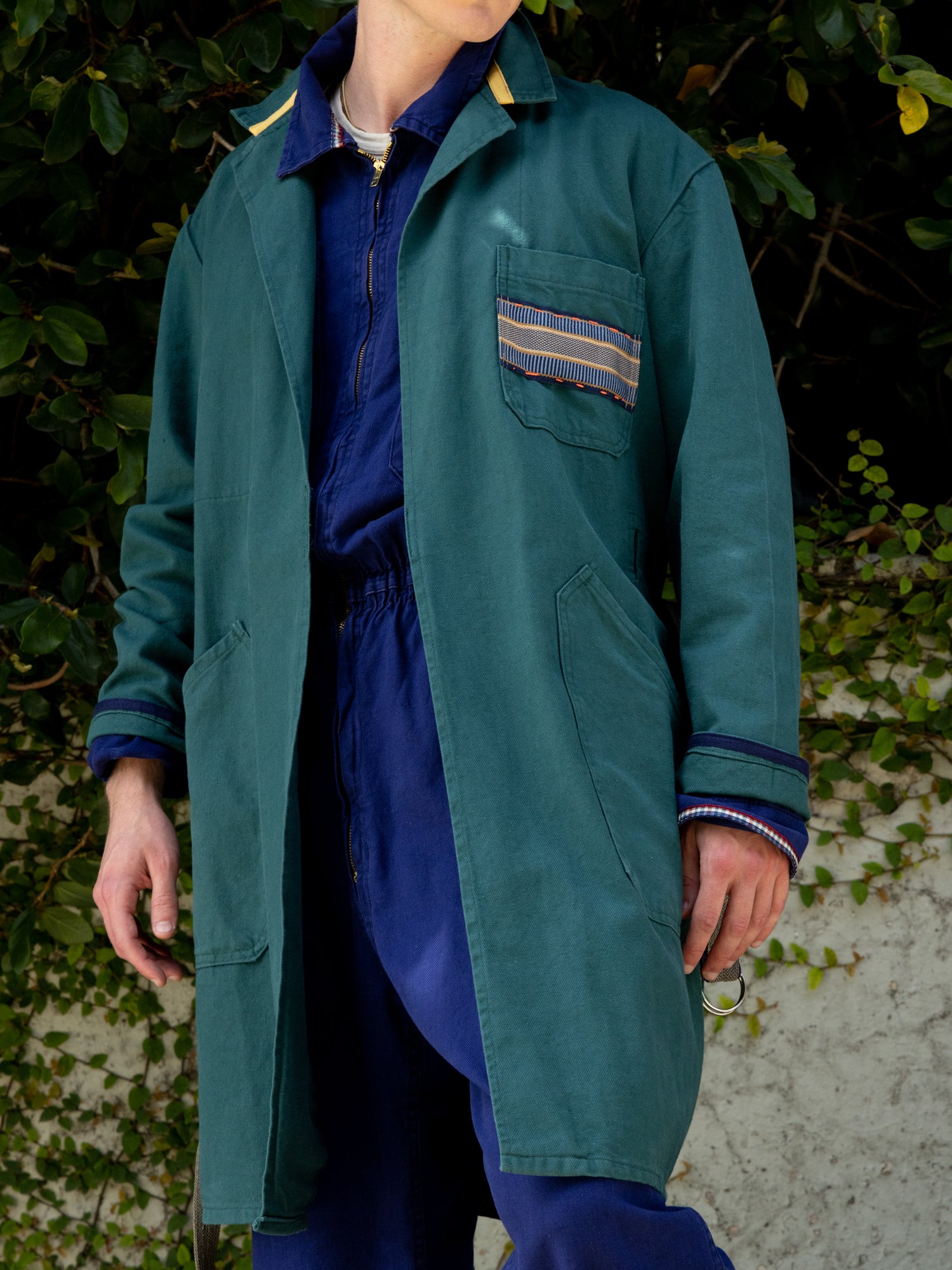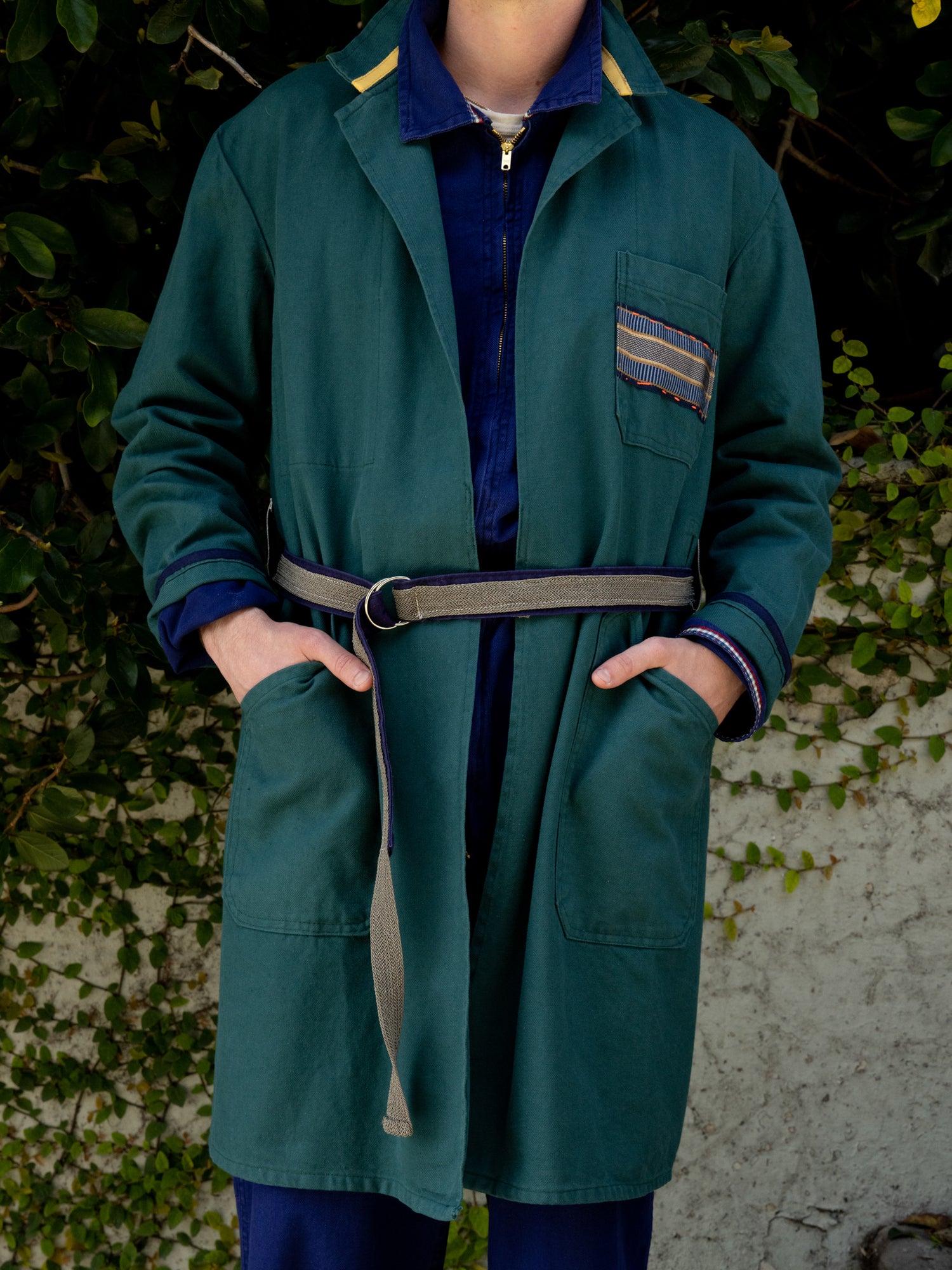 This one-of-a-kind secondhand workwear wrap trench with belt. Has been up-cycled with packet at pocket and belt.