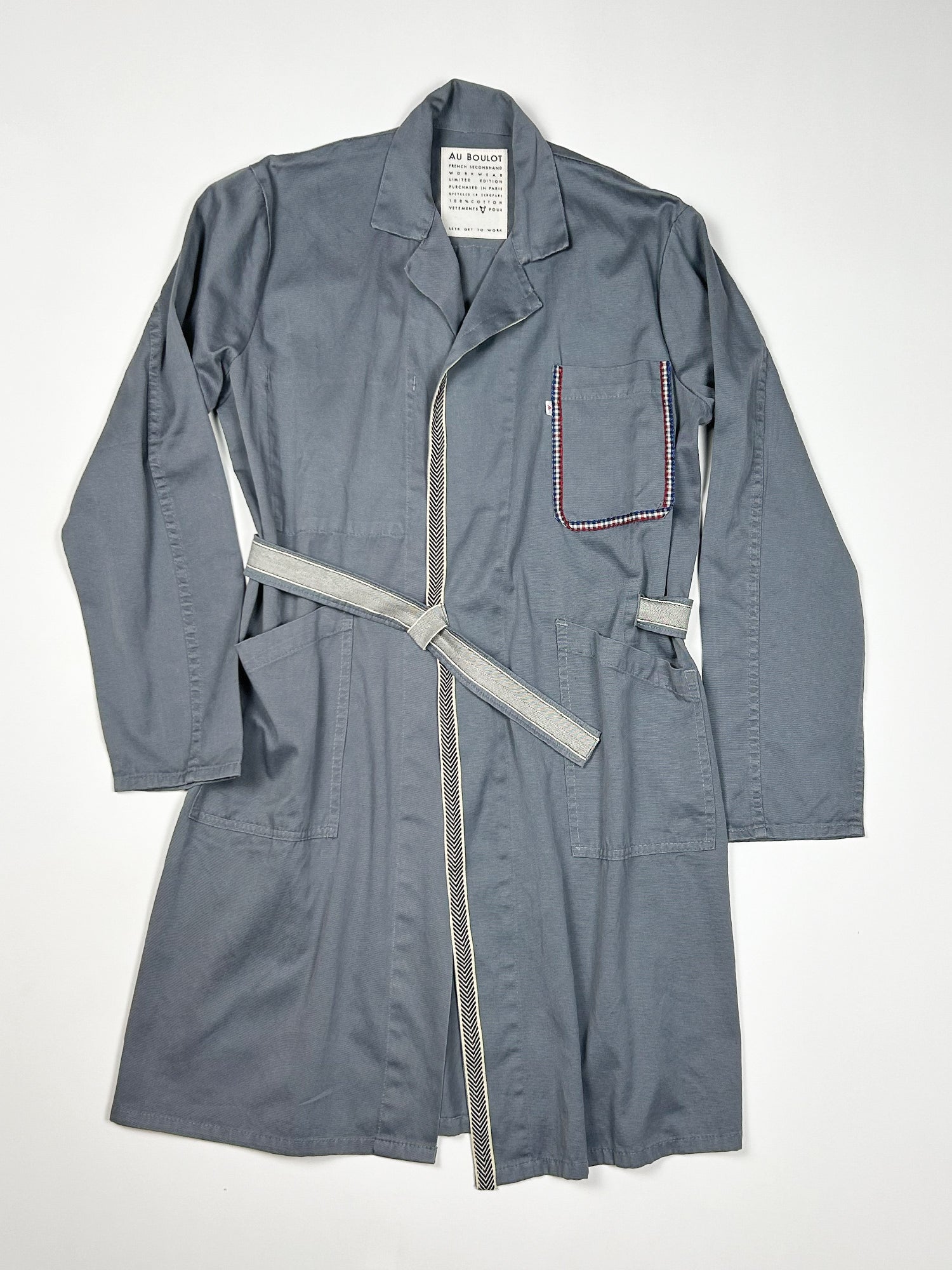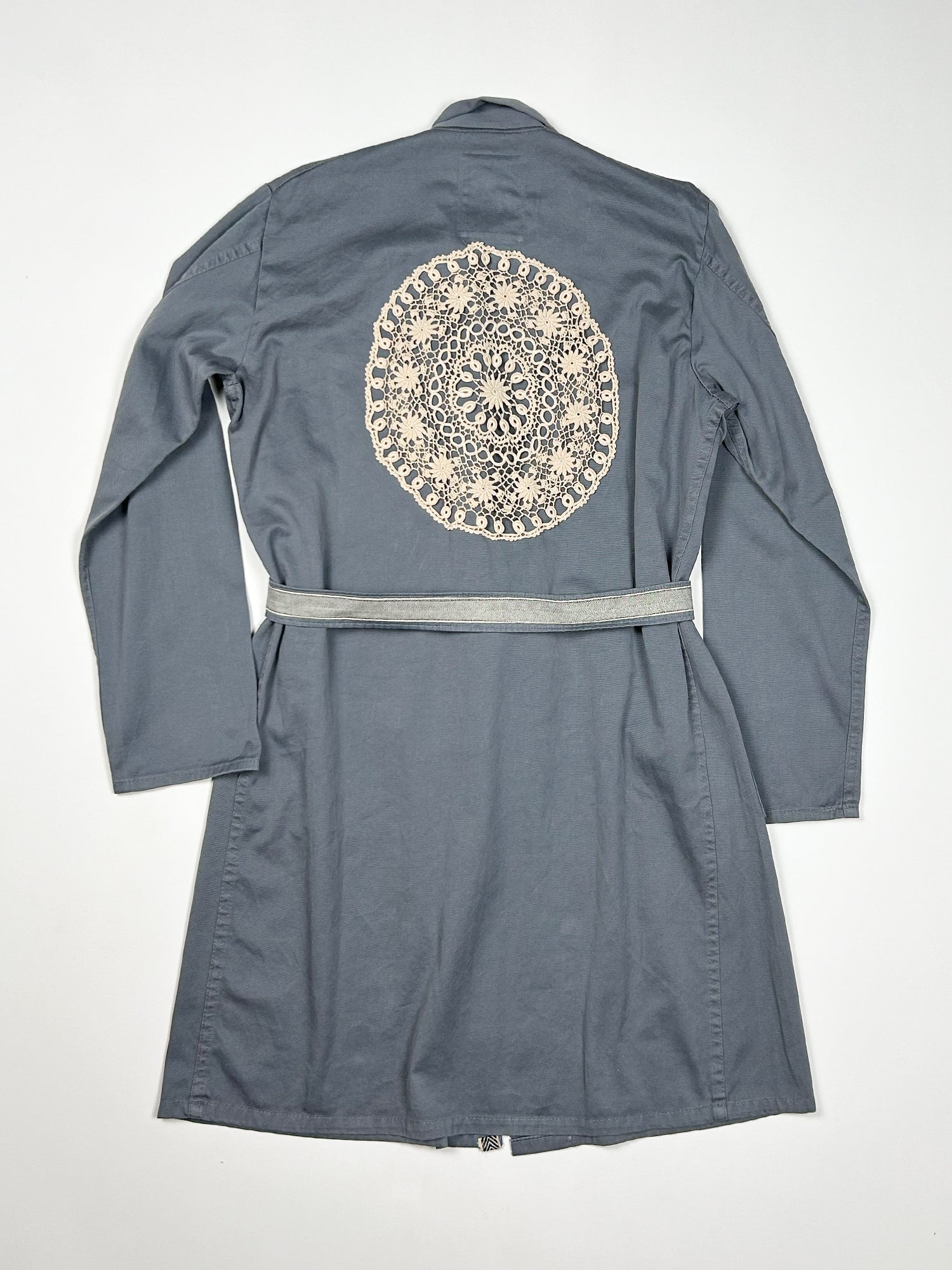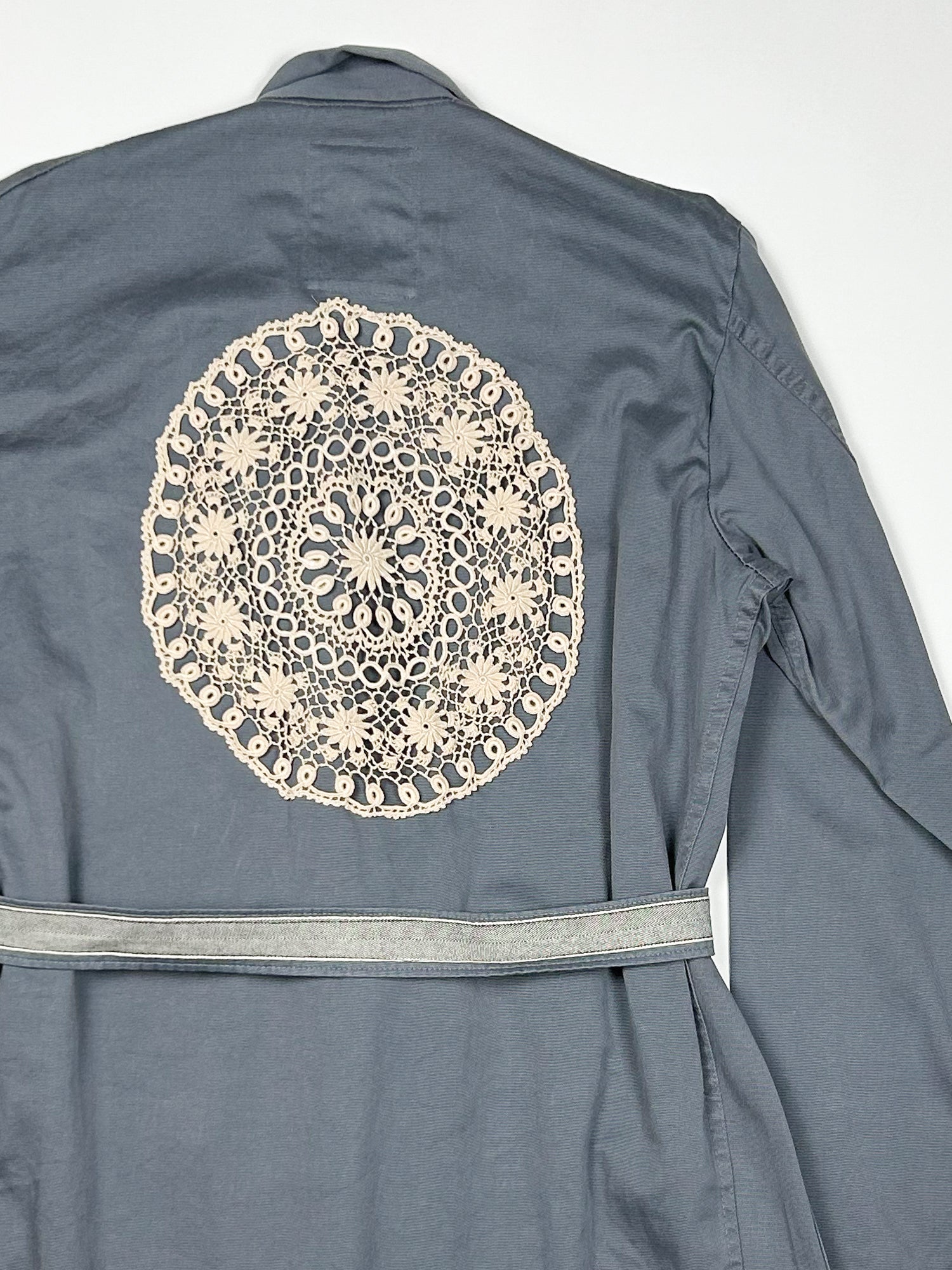 This one-of-a-kind secondhand workwear wrap trench with belt. Has been up-cycled with a trim at front placket, pocket and belt. Back has crochet applicate.