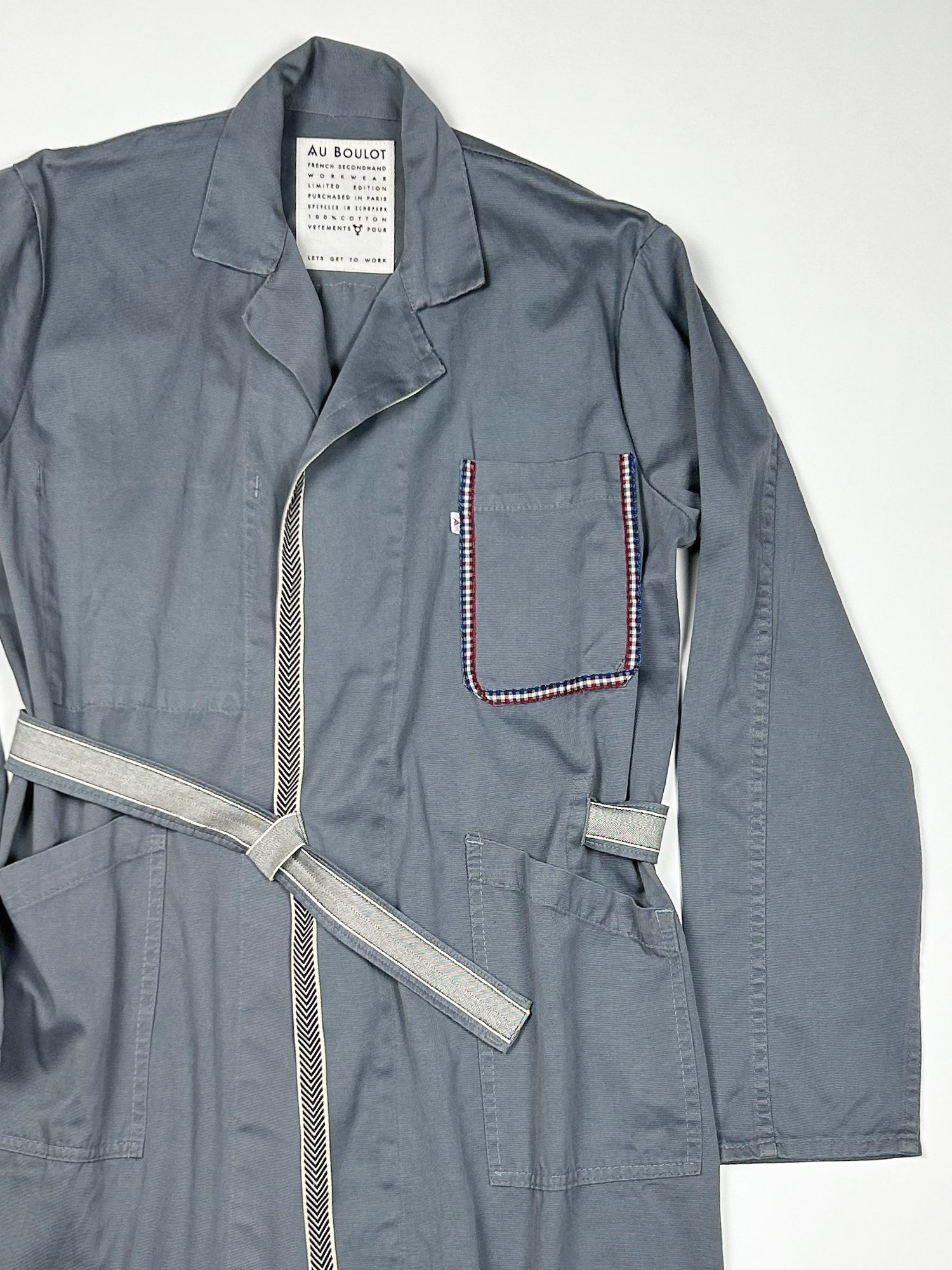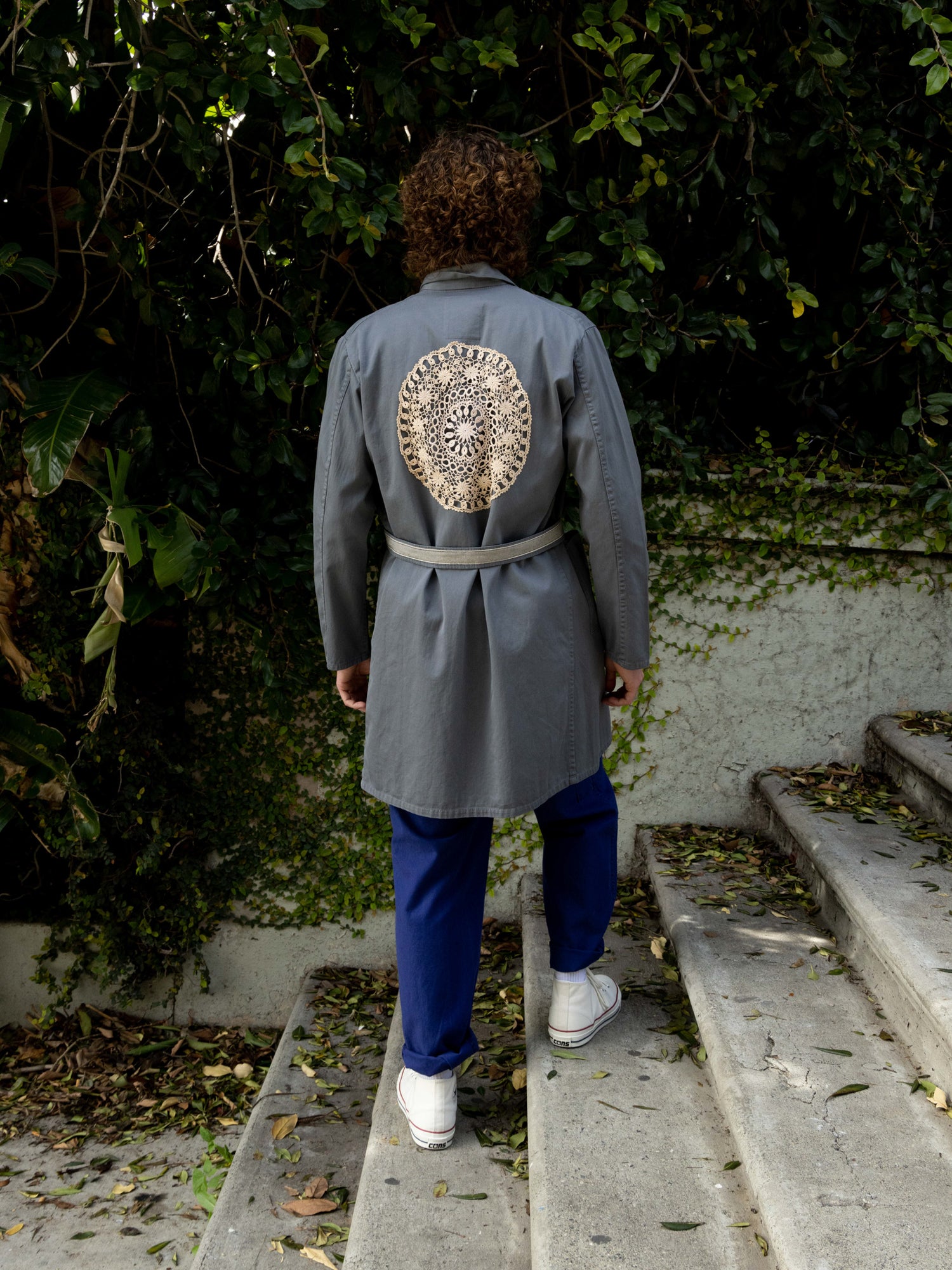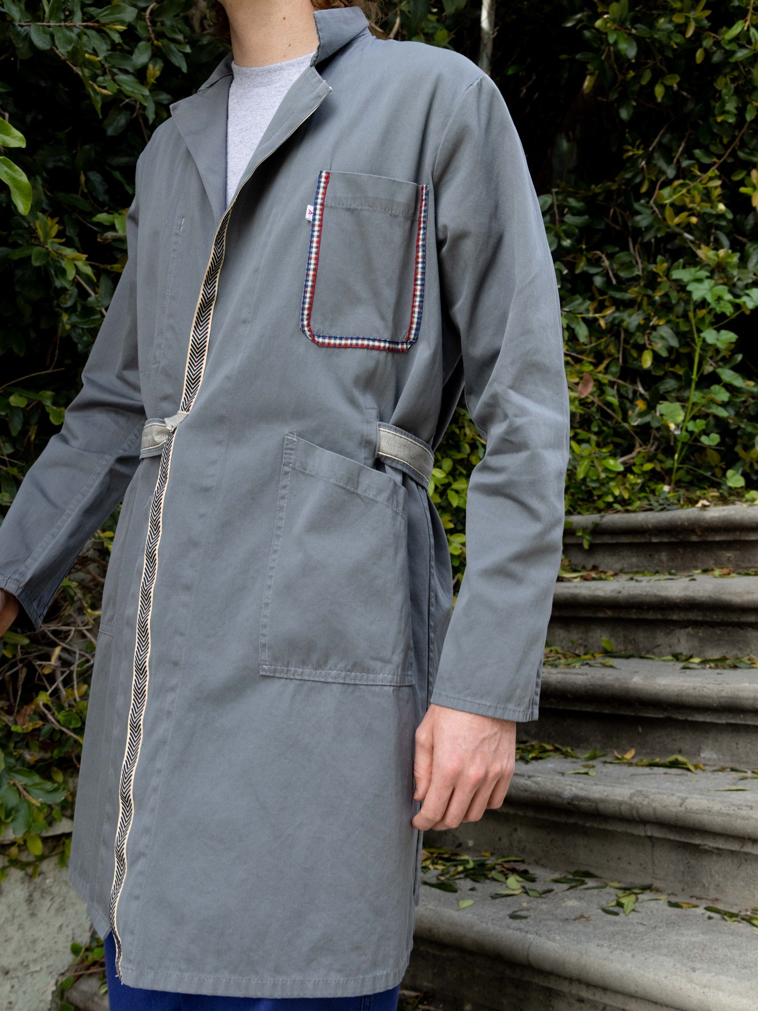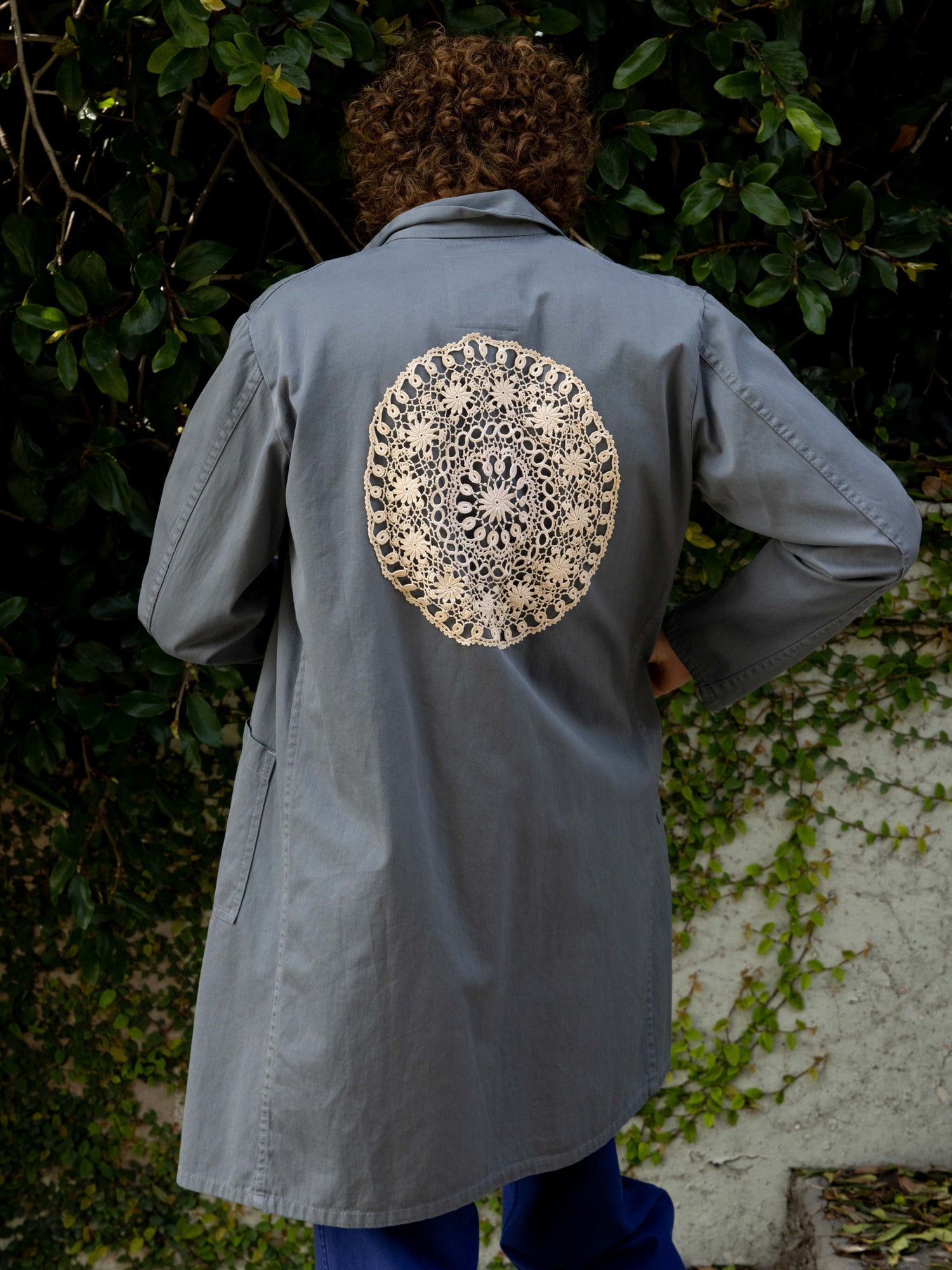 This one-of-a-kind secondhand workwear wrap trench with belt. Has been up-cycled with a trim at front placket, pocket and belt. Back has crochet applicate.