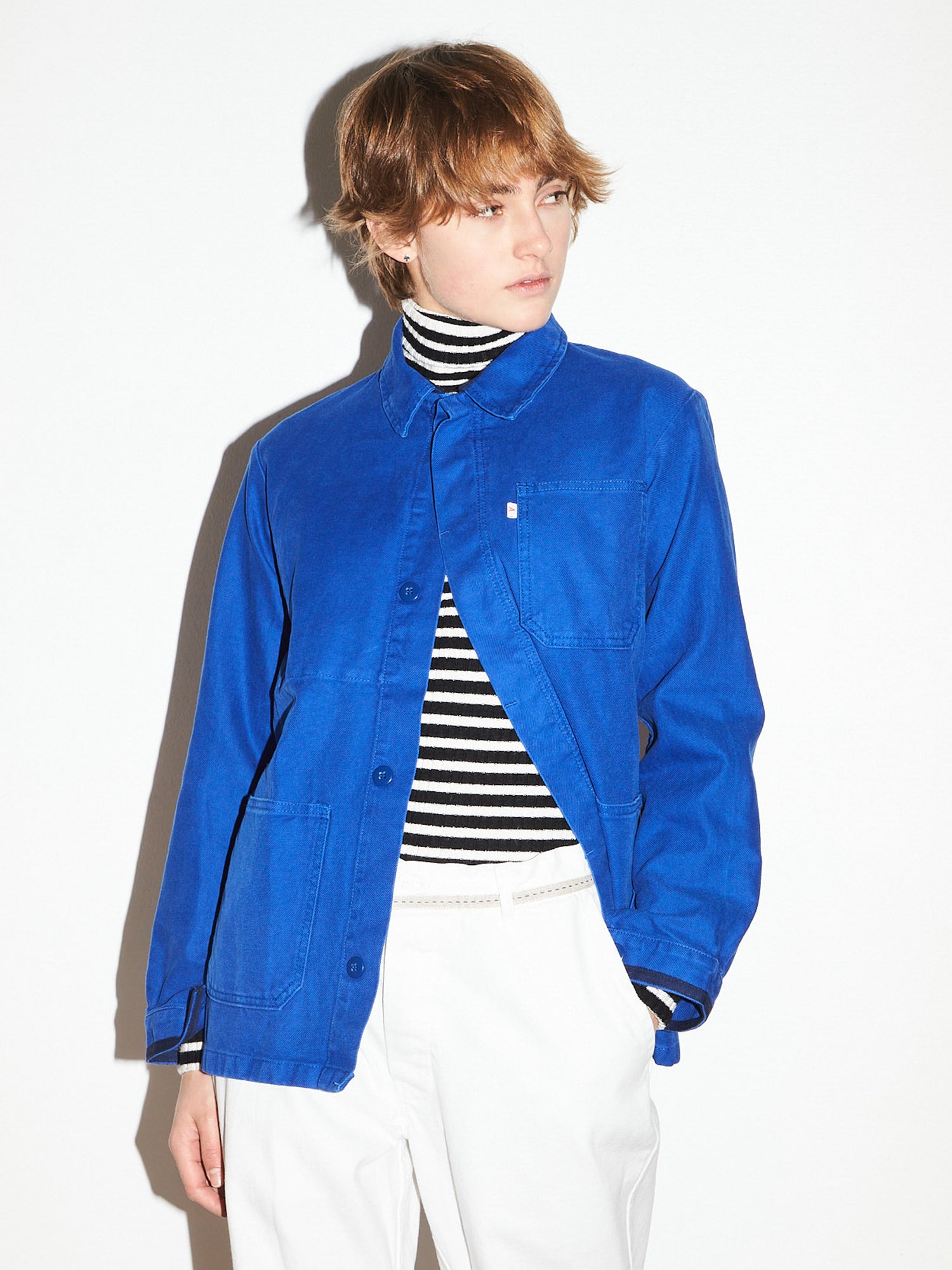 This Limited collection secondhand workwear jacket with a button front and adjustable cuffs. Has been up-cycled with ticking stripe trim at the collar.