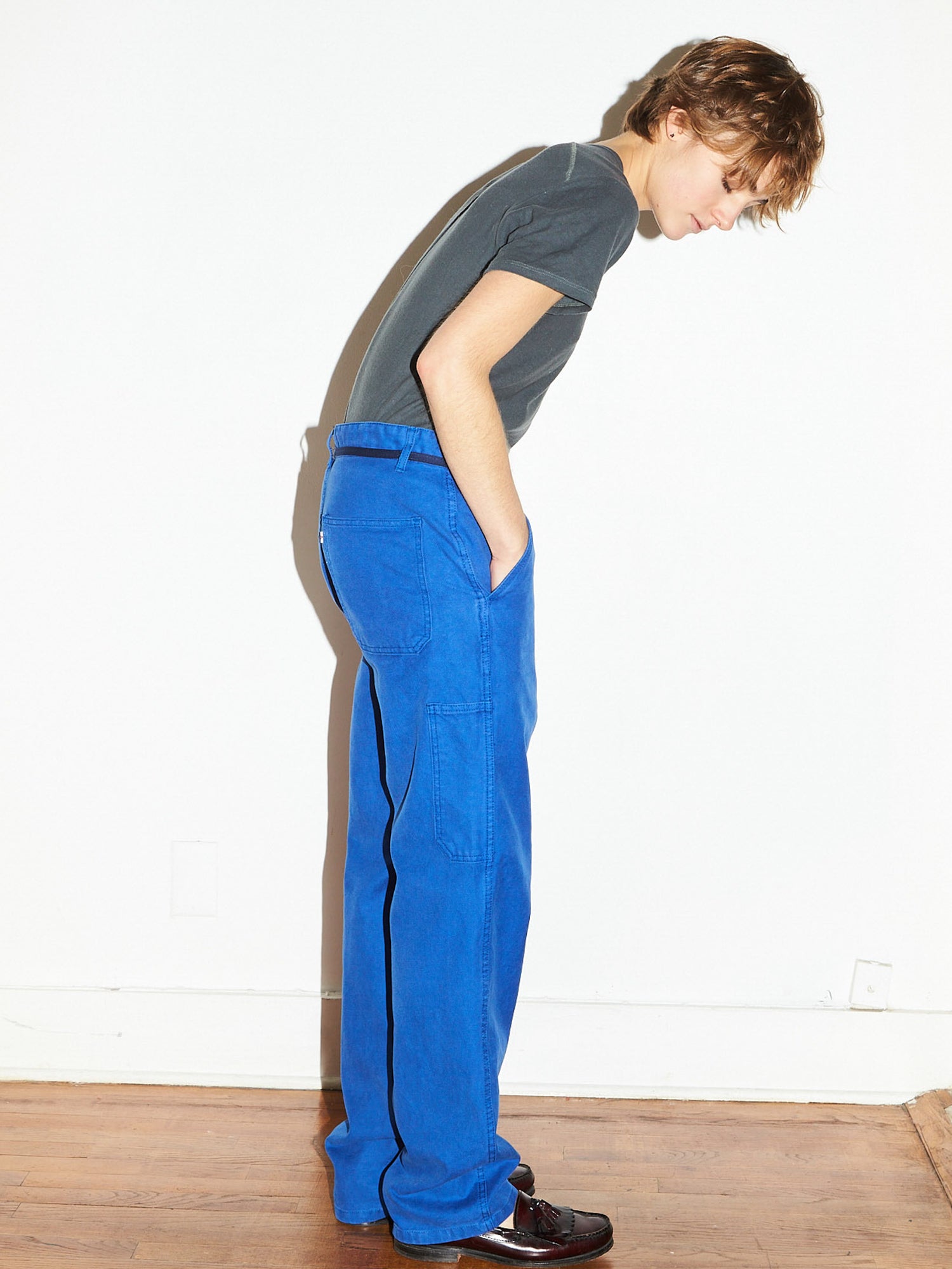 This Limited Collection secondhand workwear pant with a button fly. Has been up-cycled with woven trim details at waistband.