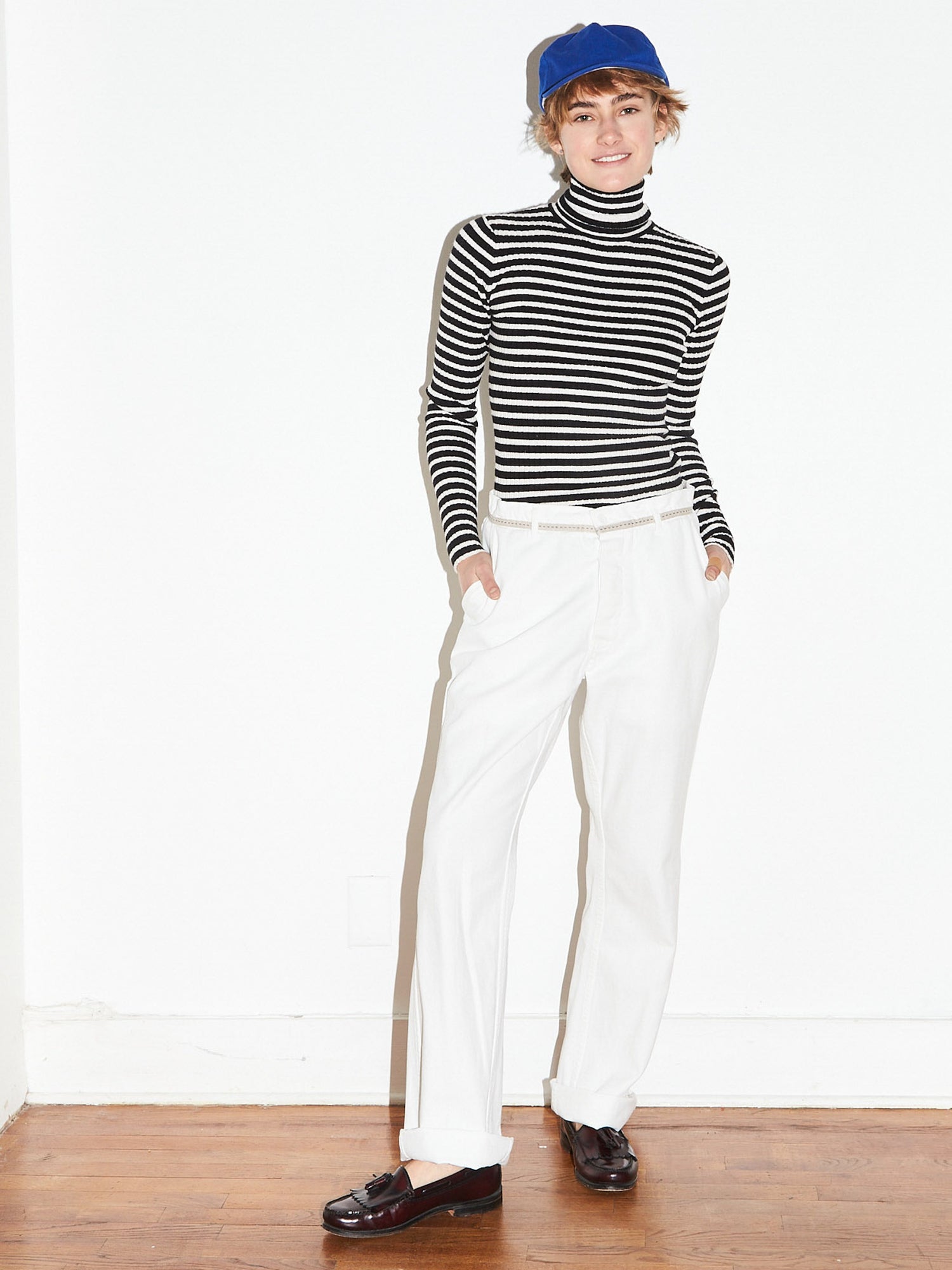 This Limited Collection secondhand workwear pant with a button fly. Has been up-cycled with woven trim details at waistband.