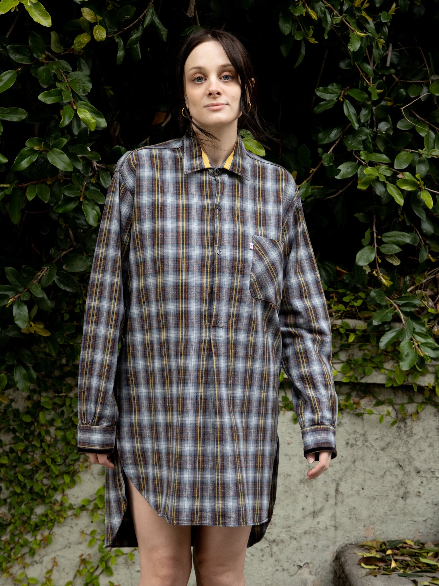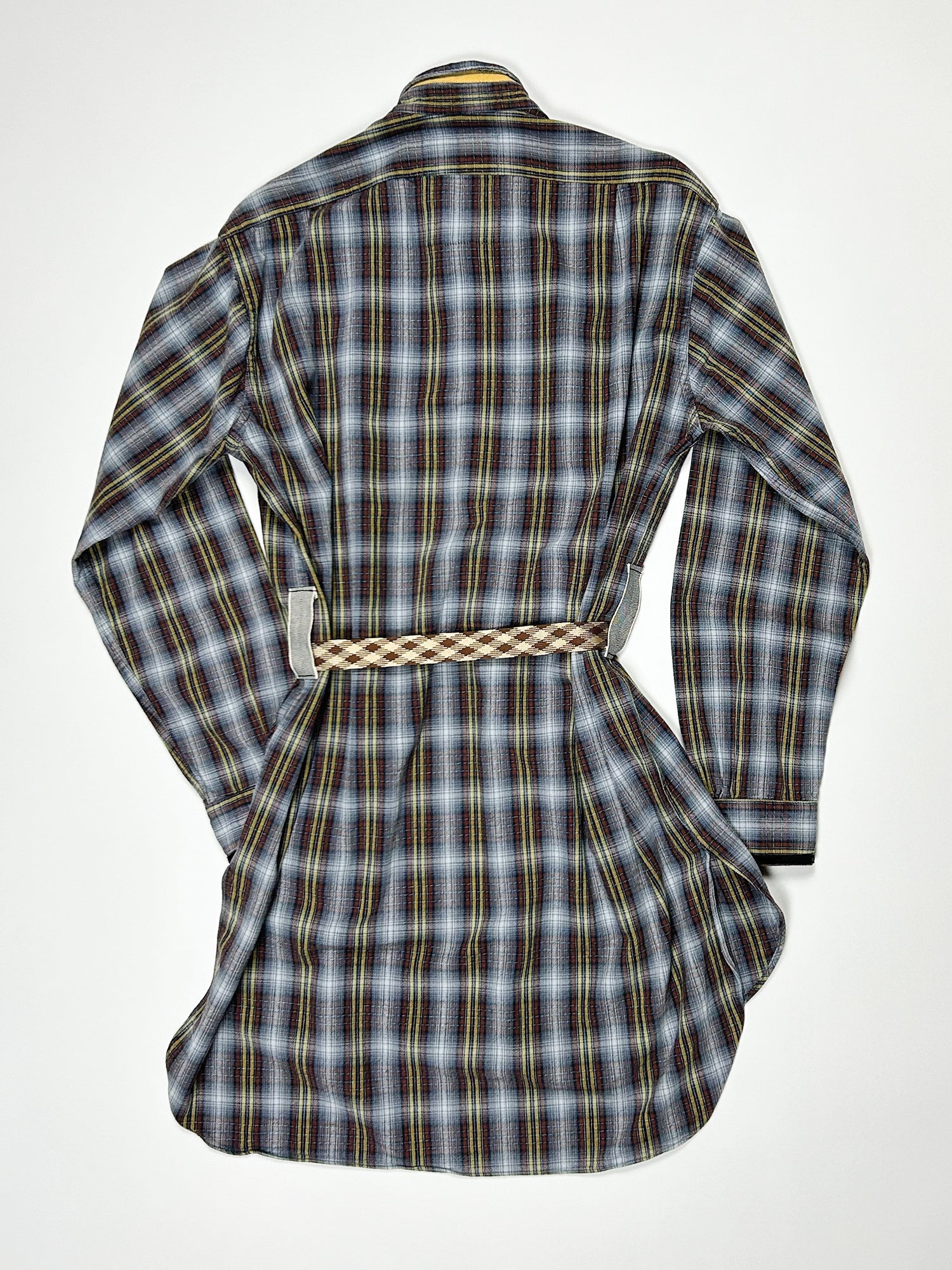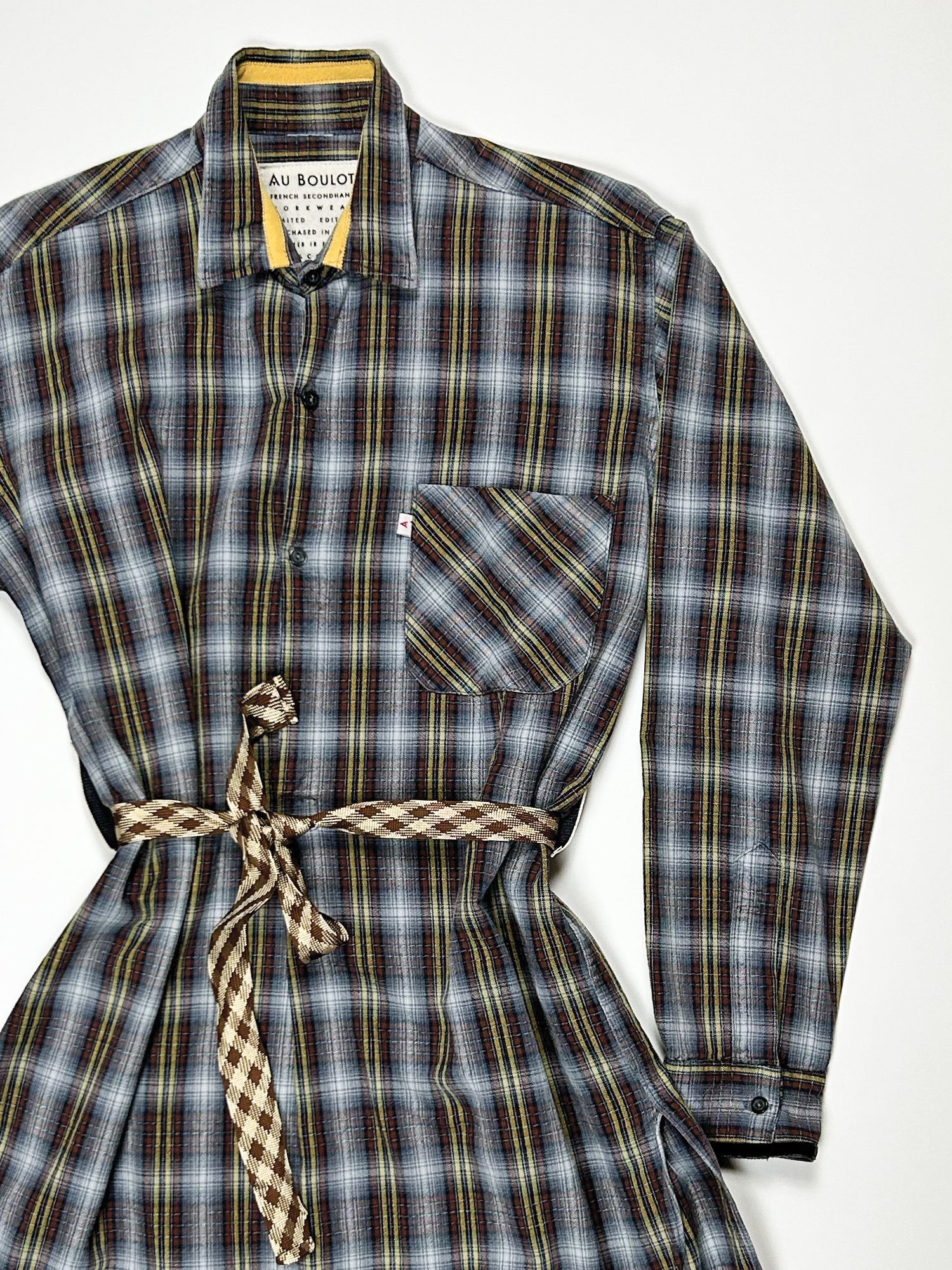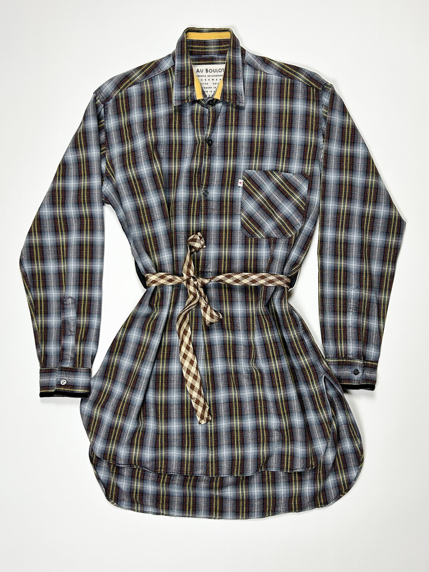This one-of-a-kind secondhand workwear shirt dress button front. Has been up-cycled with trim at collar and cuff.